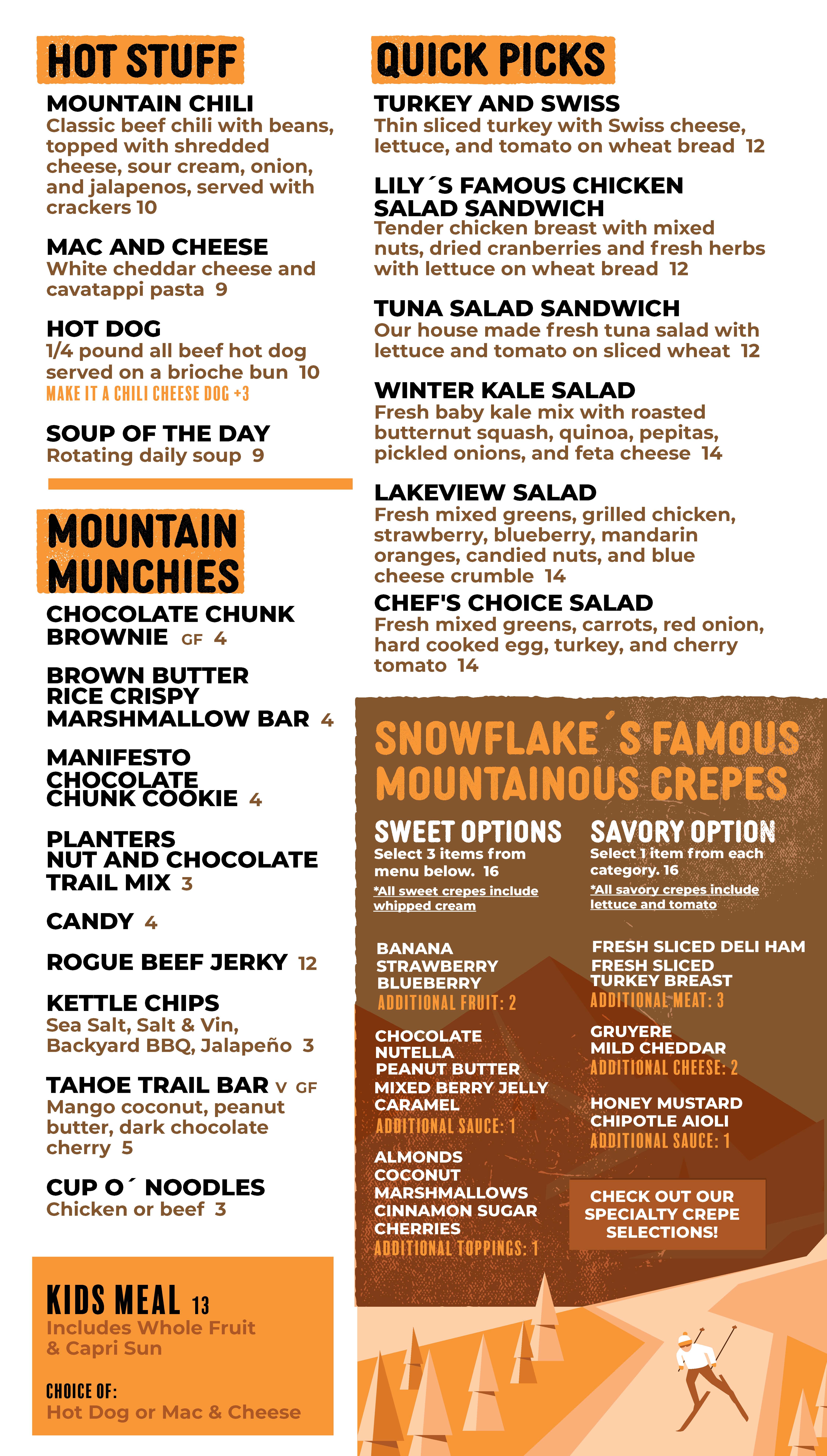 New for the 2025-26 season, our food & beverage team launched a brand new crêpe menu at Snowflake Lodge. Options include both sweet and savory, conveniently folded and easy to hold and eat with one hand. Build your own or choose from the specialty crepe menu.